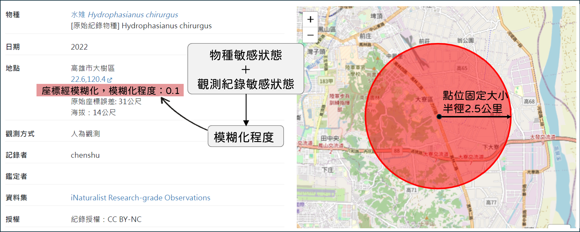 為了保護敏感物種,TBN根據臺灣生物多樣性資訊聯盟(TBIA)的生物多樣性敏感資料開放作業原則,為具有敏感性的物種及觀測資料設立了不同程度的敏感層級。系統會將原始資料的點位座標模糊化到適當的解析度後,再開放至網頁前台給使用者查詢及下載。