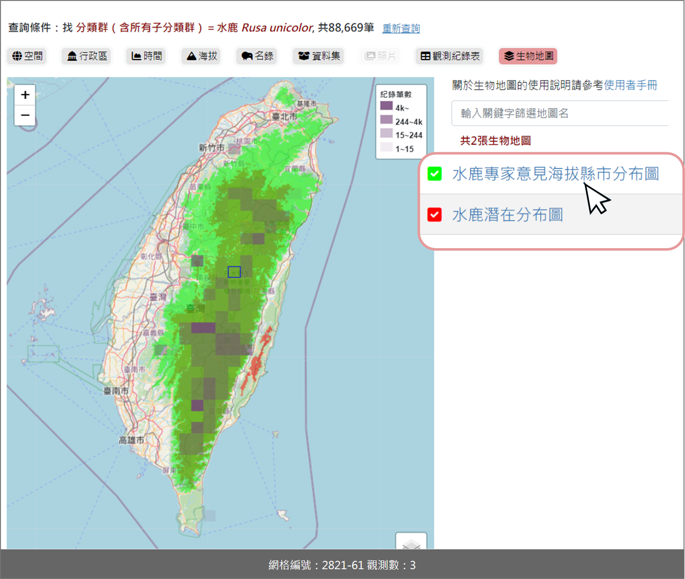 僅空間和生物類群的搜尋條件可顯示生物地圖供選取套疊