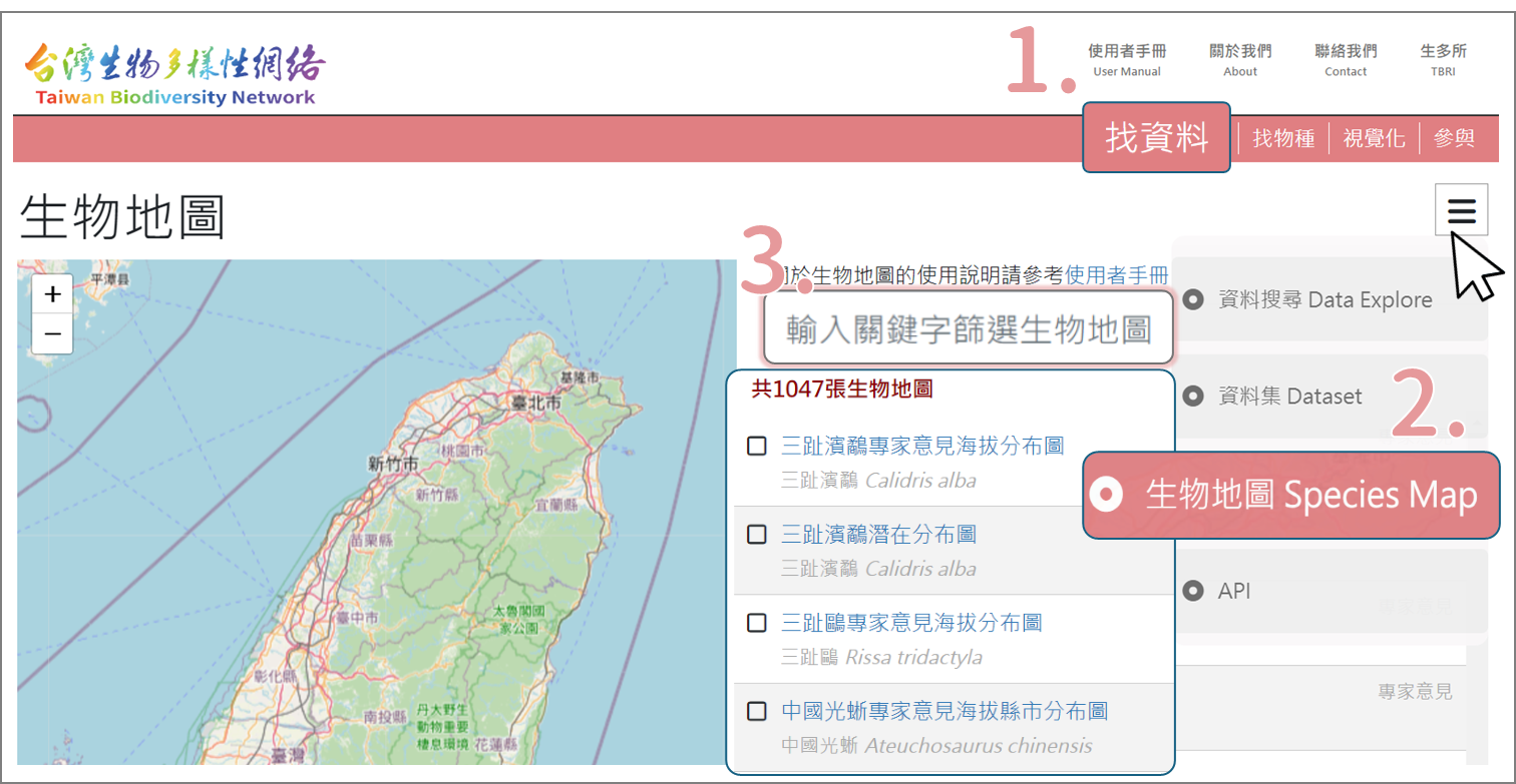 - STEP2. 右側選單(有三條線的框框)即可進入生物地圖頁面