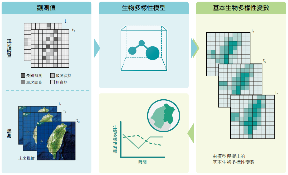 透過整合不同來源的觀測值(包含現地調查與遙測結果),建構包含完整時空變化、全面性的生物多樣性模型,從模型中獲取所需的EBVs,或根據報告的尺度(例如國家、生態區等),進一步計算生物多樣性指標,比較不同時空之生物多樣性指標,以探討生物多樣性變化。概念取自 Jetz et al . (2019)。(羅祈鈞 製圖)