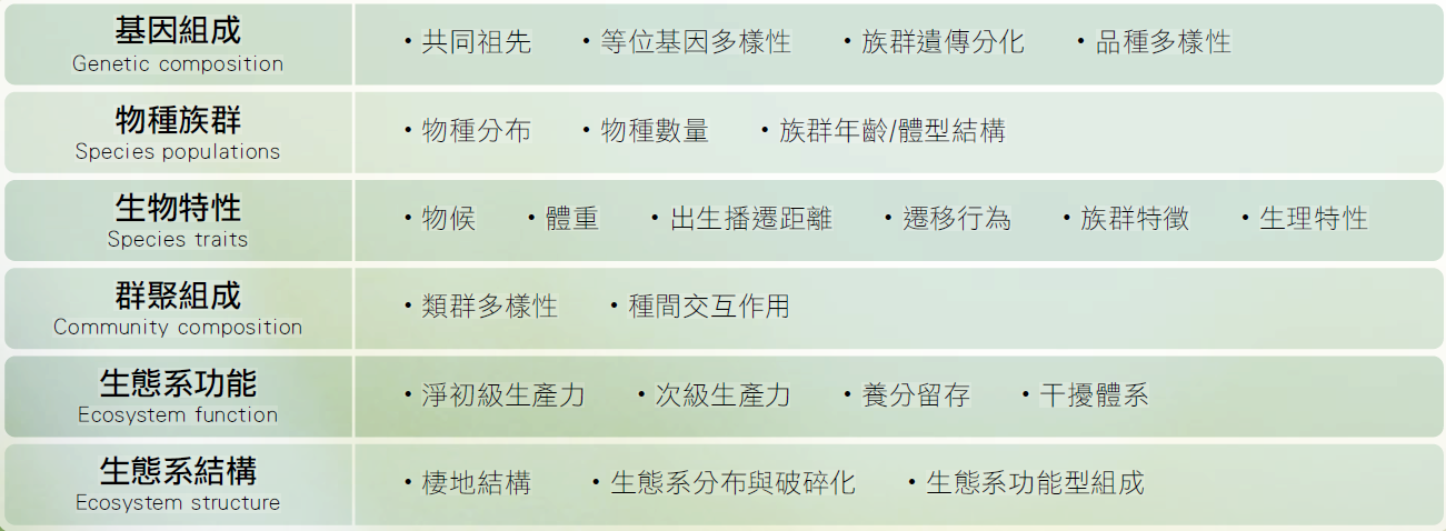 關鍵字:生物多樣性指標、全球生物多樣性資訊機構(Global Biodiversity Information Facility)、全球生物多樣性觀測網絡(GEO BON)、基本生物多樣性變數(EBVs)