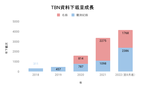 我們自2018年起提供觀測資料下載服務;2020年5月起提供名錄下載服務,下載量年年成長,尤其今年僅至8月底,觀測紀錄下載量已超過去年的兩倍。